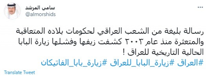 وكتب في تغريدة عبر "تويتر" رصدها "المشهد العربي": "رسالة بليغة من الشعب العراقي لحكومات بلاده المتعاقبة والمتعثرة منذ عام ٢٠٠٣ كشفت زيفها وفشلها زيارة البابا الحالية التاريخية للعراق".