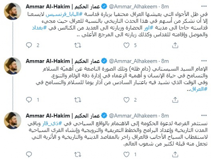 وقال في سلسلة تغريدات عبر "تويتر" رصدها "المشهد العربي": "في ظل الأجواء التي يعيشها العراق محتفيا بزيارة قداسة البابا فرنسيس لايسعنا إلا أن نشكر من أسهم في هذا الحدث التاريخي بالنسبة للعراق حيث مجيء قداسته حاجا إلى مدينة أور الحضارة وزيارته الى العديد من الكنائس في بغداد والموصل وإقامته للقداس وكذلك زيارته الى المرجع الأعلى".