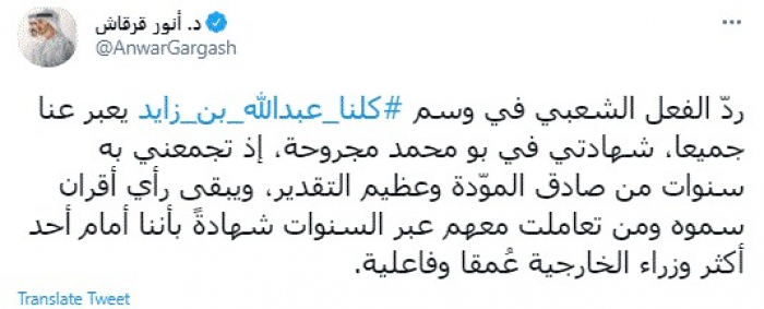 وقال في تغريدة عبر "تويتر" رصدها "المشهد العربي": "ردّ الفعل الشعبي في وسم كلنا عبدالله بن زايد يعبر عنا جميعا، شهادتي في بو محمد مجروحة، إذ تجمعني به سنوات من صادق الموّدة وعظيم التقدير، ويبقى رأي أقران سموه ومن تعاملت معهم عبر السنوات شهادةً بأننا أمام أحد أكثر وزراء الخارجية عُمقا وفاعلية".