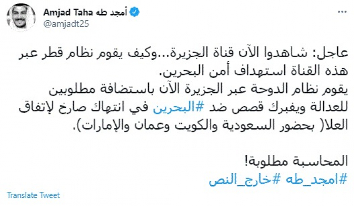 وقال في تغريدة عبر "تويتر" رصدها "المشهد العربي": "شاهدوا الآن قناة الجزيرة...وكيف يقوم نظام قطر عبر هذه القناة استهداف أمن البحرين".