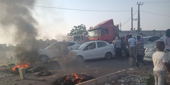 احتج مواطنون بمديرية تبن في محافظة لحج، على استمرار انقطاع الكهرباء، بقطع طريق الحسيني.