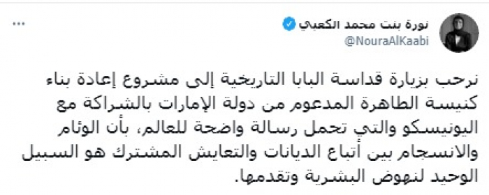 وأوضحت في تغريدة على حسابها بموقع التدوين المصغر تويتر، اليوم أننا: "نرحب بزيارة قداسة البابا التاريخية إلى مشروع إعادة بناء كنيسة الطاهرة المدعوم من دولة الإمارات بالشراكة مع اليونيسكو".