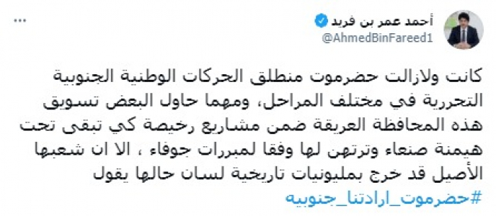 وقال في تغريدة على حسابه بموقع التدوين المصغر تويتر، اليوم إنه: "كانت ولا زالت حضرموت منطلق الحركات الوطنية الجنوبية التحررية في مختلف المراحل".