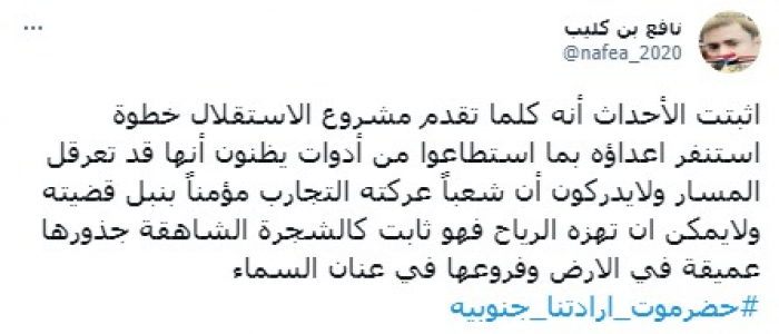وأكد أن أعداء الجنوب: "لا يدركون أن شعبا عركته التجارب مؤمنا بنبل قضيته ولا يمكن أن تهزه الرياح فهو ثابت كالشجرة الشاهقة جذورها عميقة في الأرض وفروعها في عنان السماء"، مختتما تغريدته بهاشتاج: "حضرموت إرادتنا جنوبية".