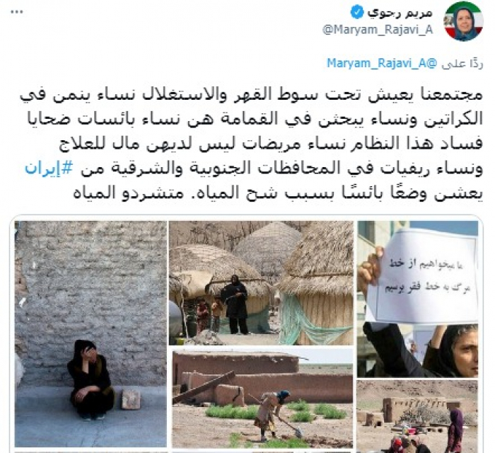 وأوضحت: "هن نساء بائسات ضحايا فساد هذا النظام، نساء مريضات ليس لديهن مال للعلاج ونساء ريفيات في المحافظات الجنوبية والشرقية من إيران يعشن وضعًا بائسًا بسبب شح المياه، متشردو المياه".