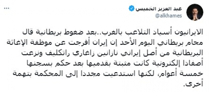 وأوضح أنه: "بعد ضغوط بريطانية قال محام بريطاني اليوم الأحد إن إيران أفرجت عن موظفة الإغاثة البريطانية من أصل إيراني نازانين زاغاري راتكليف ونزعت أصفادا إلكترونية كانت مثبتة بقدميها بعد حكم بسجنها خمسة أعوام".