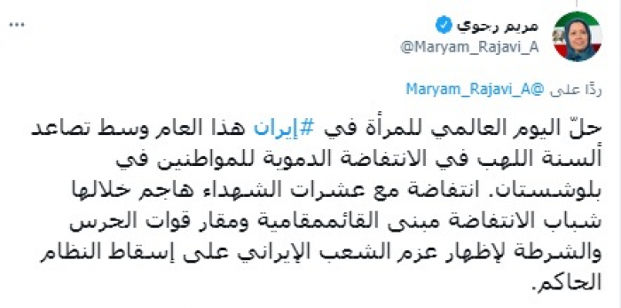 وأشارت في تغريدة على حسابها بموقع التدوين المصغر تويتر، اليوم إلى أنه: "حلّ اليوم العالمي للمرأة في إيران هذا العام وسط تصاعد ألسنة اللهب في الانتفاضة الدموية للمواطنين في بلوشستان".