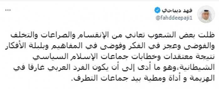 اعتبر المحلل السياسي السعودي فهد ديباجي أن انقسام الشعوب العربية نتيجة خطاب جماعات الإسلام السياسي الشيطانية.