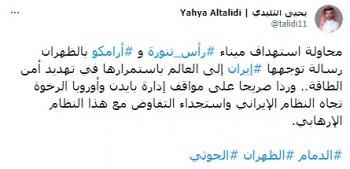 وقال في تغريدة على حسابه بموقع التدوين المصغر تويتر، اليوم إن: "محاولة استهداف ميناء رأس تنورة وأرامكو بالظهران رسالة توجهها إيران إلى العالم باستمرارها في تهديد أمن الطاقة".