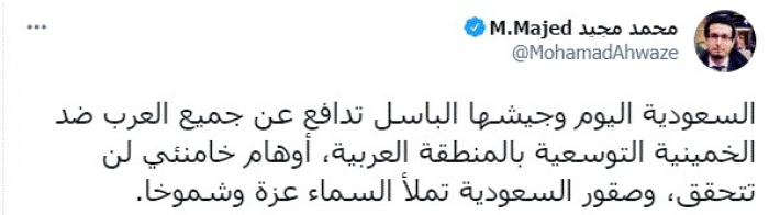 وكتب في تغريدة عبر "تويتر" رصدها "المشهد العربي": "السعودية اليوم وجيشها الباسل تدافع عن جميع العرب ضد الخمينية التوسعية بالمنطقة العربية، أوهام خامنئي لن تتحقق، وصقور السعودية تملأ السماء عزة وشموخًا".