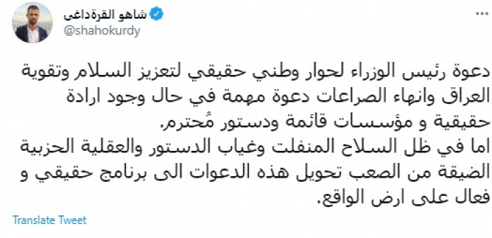 علق الكاتب الصحفي العراقي شاهو القرةداغي، اليوم، على دعوة رئيس الوزراء العراقي مصطفى الكاظمي لحوار وطني حقيقي لتعزيز السلام وتقوية العراق.