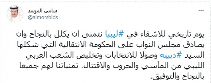 وقال في تغريدة عبر "تويتر" رصدها "المشهد العربي": "يوم تاريخي للأشقاء في ليبيا نتمنى أن يكلل بالنجاح وأن يصادق مجلس النواب على الحكومة الانتقالية التي شكلها السيد دبيبة وصولاً للانتخابات وتخليص الشعب العربي الليبي من المآسي والحروب والاقتتال. تمنياتنا لهم جميعا بالنجاح والتوفيق".