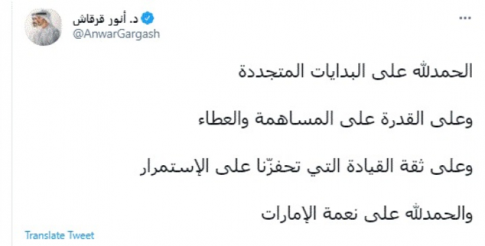 وقال في تغريدة عبر "تويتر" رصدها "المشهد العربي": "الحمدلله على البدايات المتجددة وعلى القدرة على المساهمة والعطاء وعلى ثقة القيادة التي تحفزّنا على الإستمرار والحمدلله على نعمة الإمارات".