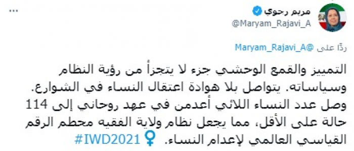 وشددت على أنه: "يتواصل بلا هوادة اعتقال النساء في الشوارع"، مضيفة: "وصل عدد النساء اللائي أعدمن في عهد روحاني إلى 114 حالة على الأقل، مما يجعل نظام ولاية الفقيه محطم الرقم القياسي العالمي لإعدام النساء".