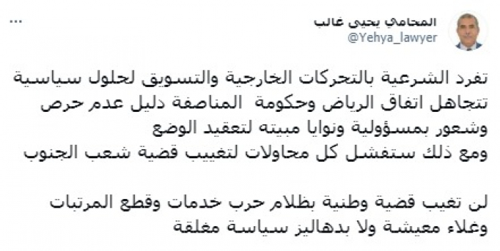 حذر الناشط السياسي يحيى غالب من تحركات الشرعية الإخوانية خارجيًا للتسويق لمشروع يتجاهل اتفاق الرياض وحكومة المناصفة لتغييب قضية شعب الجنوب.