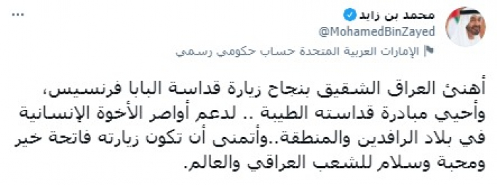 هنأ ولي عهد أبو ظبي، نائب القائد الأعلى للقوات المسلحة الإماراتية، رئيس المجلس التنفيذي لإمارة أبو ظبي، الشيخ محمد بن زايد، العراق بنجاح زيارة البابا فرنسيس بابا الفاتيكان إلى بغداد.