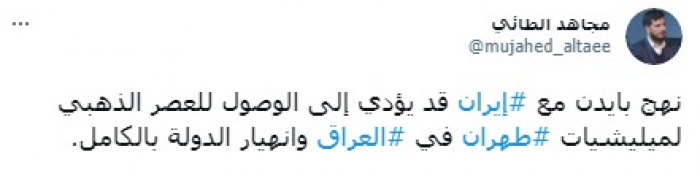 وأكد في تغريدة على حسابه بموقع التدوين المصغر تويتر، اليوم أن: "نهج بايدن مع إيران قد يؤدي إلى الوصول للعصر الذهبي لميليشيات طهران في العراق وانهيار الدولة بالكامل".