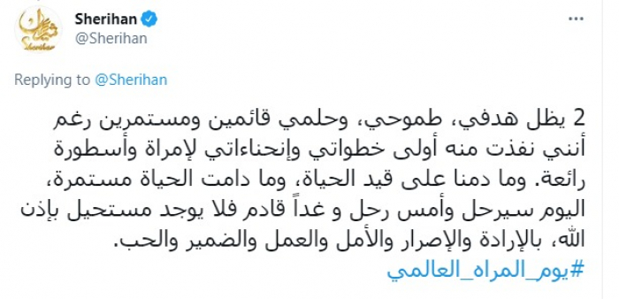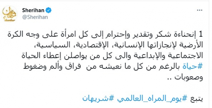وكتبت شريهان، عبر حسابها على تويتر: "إنحناءة شكر وتقدير وإحترام إلى كل امرأة على وجه الكرة الأرضية لإنجازاتها الإنسانية، الإقتصادية، السياسية، الإجتماعية، والإبداعية وإلى كل من يواصلن إعطاء الحياة حياة بالرغم من كل ما نعيشه من فراق وألم وضغوط وصعوبات".