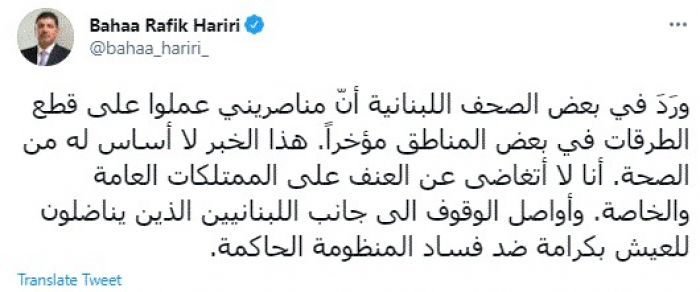 وقال في تغريدة عبر "تويتر" رصدها "المشهد العربي": "ورَدَ في بعض الصحف اللبنانية أنّ مناصريني عملوا على قطع الطرقات في بعض المناطق مؤخراً. هذا الخبر لا أساس له من الصحة. أنا لا أتغاضى عن العنف على الممتلكات العامة والخاصة. وأواصل الوقوف الى جانب اللبنانيين الذين يناضلون للعيش بكرامة ضد فساد المنظومة الحاكمة".