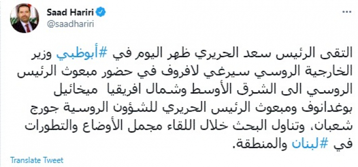وقال في تغريدة عبر "تويتر" رصدها "المشهد العربي": "التقى الرئيس سعد الحريري ظهر اليوم في أبوظبي وزير الخارجية الروسي سيرغي لافروف في حضور مبعوث الرئيس الروسي الى الشرق الأوسط وشمال إفريقيا ميخائيل بوغدانوف ومبعوث الرئيس الحريري للشؤون الروسية جورج شعبان، وتناول البحث خلال اللقاء مجمل الأوضاع والتطورات في لبنان والمنطقة".