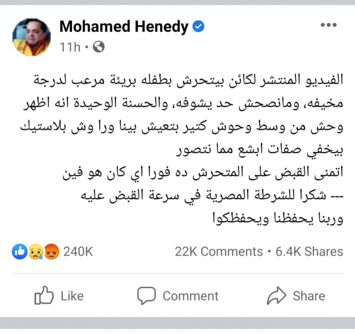 وقدم "هنيدي" الشكر للشرطة المصرية عبر صفحته الرسمية بموقع "فيسبوك" على سرعة القبض عليه، فقد تمكنت الأجهزة الأمنية بالقاهرة من القبض على شاب ظهر في مقطع فيديو متداول أثناء تحرشه بطفلة داخل مدخل عقار بالمعادي.