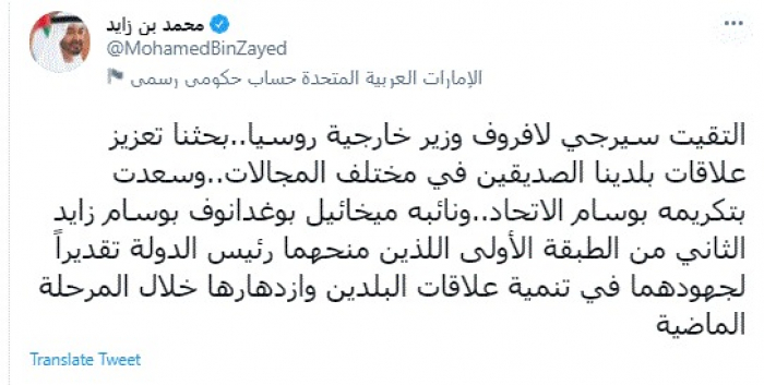 وقال في تغريدة عبر "تويتر" رصدها "المشهد العربي": "التقيت سيرجي لافروف وزير خارجية روسيا..بحثنا تعزيز علاقات بلدينا الصديقين في مختلف المجالات..وسعدت بتكريمه بوسام الاتحاد..ونائبه ميخائيل بوغدانوف بوسام زايد الثاني من الطبقة الأولى اللذين منحهما رئيس الدولة تقديراً لجهودهما في تنمية علاقات البلدين وازدهارها خلال المرحلة الماضية".