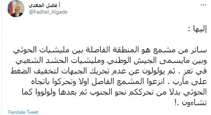 قال عضو هيئة رئاسة المجلس الانتقالي الجنوبي فضل الجعدي، اليوم، إن هناك ساتر من مشمع هو المنطقة الفاصلة بين مليشيات الحوثي وبين ما يسمى الجيش الوطني ومليشيات الحشد الشعبي في تعز.