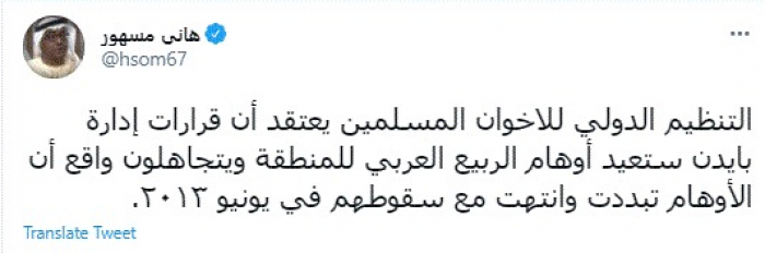 وكتب في تغريدة عبر "تويتر" رصدها "المشهد العربي": "التنظيم الدولي للاخوان المسلمين يعتقد أن قرارات إدارة بايدن ستعيد أوهام الربيع العربي للمنطقة ويتجاهلون واقع أن الأوهام تبددت وانتهت مع سقوطهم في يونيو ٢٠١٣".