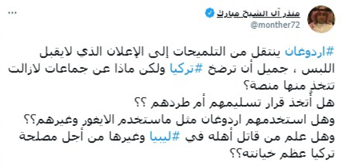وتساءل: "هل أُتخذ قرار تسليمهم أم طردهم؟؟، وهل استخدمهم أردوغان مثلما استخدم الأيغور وغيرهم؟؟ وهل علم من قاتل أهله في ليبيا وغيرها من أجل مصلحة تركيا عظم خيانته؟؟".