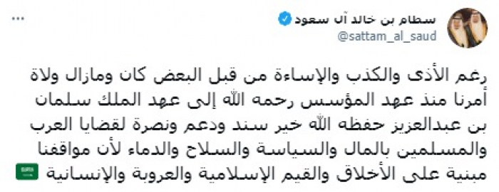 أكد الأمير السعودي سطام بن خالد آل سعود أن المملكة منذ عهد المؤسس إلى عهد خادم الحرمين الشريفين الملك سلمان بن عبدالعزيز، خير سند وداعم لقضايا الأمتين العربية والإسلامية.