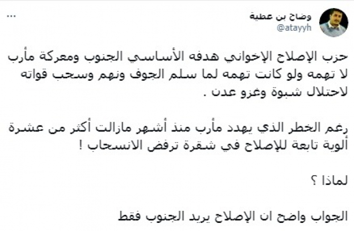 وأضاف: "رغم الخطر الذي يهدد مأرب منذ أشهر ما زالت أكثر من عشرة ألوية تابعة للإصلاح في شقرة ترفض الانسحاب، متسائلا: "لماذا؟ الجواب واضح أن الإصلاح يريد الجنوب فقط".