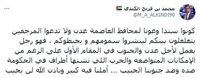 وقال في تغريدة على حسابه بموقع التدوين المصغر تويتر، اليوم: "كونوا سندا وعونا لمحافظ العاصمة عدن ولا تدعوا المرجفين يتغلغلون بينكم لينشروا سمومهم ويحبطوكم".