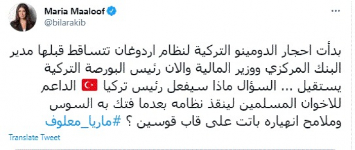 وجهت الإعلامية اللبنانية ماريا معلوف، اليوم، تساؤلاً ناريًا للرئيس التركي رجب طيب أردوغان، بعد الاستقالات التي تعصف برموز نظامه.