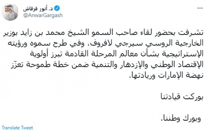 وقال في تغريدة عبر "تويتر" رصدها "المشهد العربي": "تشرفت بحضور لقاء صاحب السمو الشيخ محمد بن زايد بوزير الخارجية الروسي سيرجي لافروف، وفي طرح سموه ورؤيته الإستراتيجية بشأن معالم المرحلة القادمة تبرز أولوية الإقتصاد الوطني والإزدهار والتنمية ضمن خطة طموحة تعزّز نهضة الإمارات وريادتها".