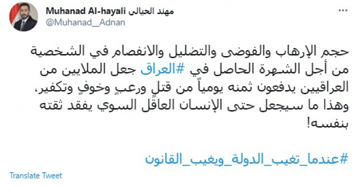 وكتب في تغريدة عبر "تويتر" رصدها "المشهد العربي": "حجم الإرهاب والفوضى والتضليل والانفصام في الشخصية من أجل الشهرة الحاصل في العراق جعل الملايين من العراقيين يدفعون ثمنه يومياً من قتلٍ ورعبٍ وخوفٍ وتكفير، وهذا ما سيجعل حتى الإنسان العاقل السوي يفقد ثقته بنفسه".