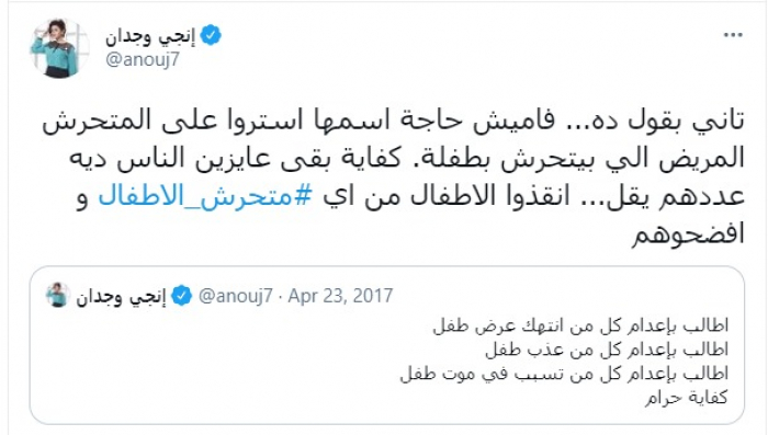 وكتبت "وجدان" تغريدة، عبر حسابها بموقع "تويتر"، قالت فيها: " تاني بقول ده، مافيش حاجة اسمها استروا على المتحرش المريض اللي بيتحرش بطفلة، كفاية بقى عايزين الناس ديه عددهم يقل، انقذوا الاطفال من أي متحرش الأطفال و افضحوهم".