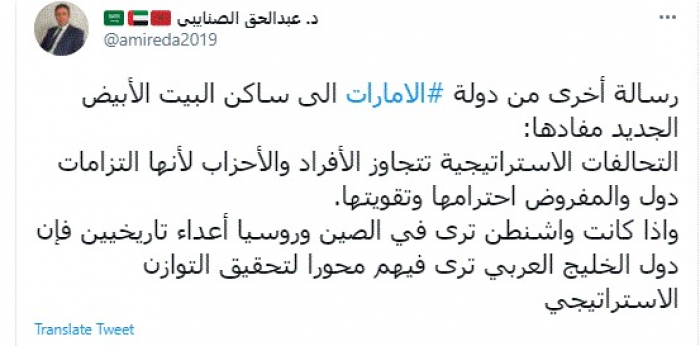 وكتب في تغريدة عبر "تويتر" رصدها "المشهد العربي": "رسالة أخرى من دولة الإمارات إلى ساكن البيت الأبيض الجديد مفادها: التحالفات الاستراتيجية تتجاوز الأفراد والأحزاب لأنها التزامات دول والمفروض احترامها وتقويتها".