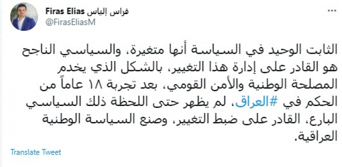 وكتب في تغريدة عبر "تويتر" رصدها "المشهد العربي": "الثابت الوحيد في السياسة أنها متغيرة، والسياسي الناجح هو القادر على إدارة هذا التغيير، بالشكل الذي يخدم المصلحة الوطنية والأمن القومي، بعد تجربة ١٨ عاماً من الحكم في العراق، لم يظهر حتى اللحظة ذلك السياسي البارع، القادر على ضبط التغيير، وصنع السياسة الوطنية العراقية".