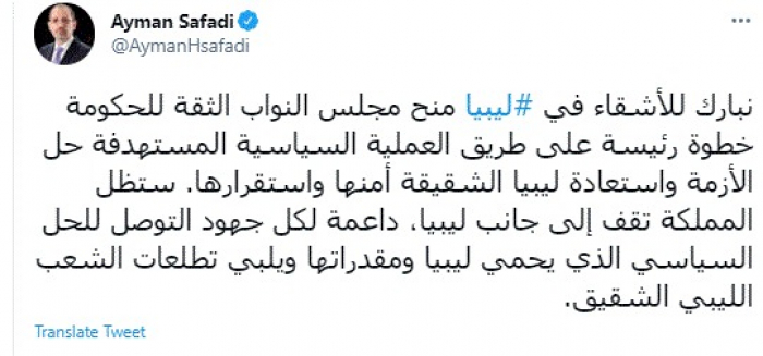 قال نائب رئيس الوزراء وزير الخارجية الأردني أيمن الصفدي، اليوم، إن منح مجلس النواب الليبي الثقة للحكومة خطوة رئيسية على طريق العملية السياسية المستهدفة حل الأزمة واستعادة ليبيا أمنها واستقرارها.