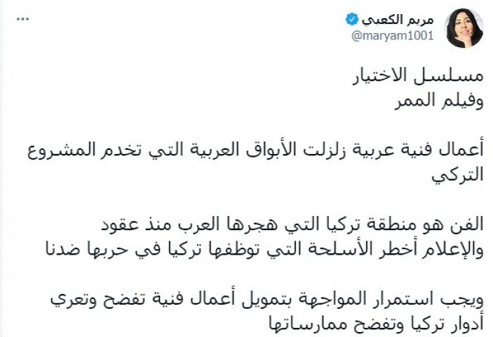قالت الكاتبة والإعلامية الإماراتية مريم الكعبي، اليوم، إن بعض الأعمال الفنية زلزلت الأبواق العرابية التي تخدم المشروع التركي مثل مسلسل الاختيار وفيلم الممر.