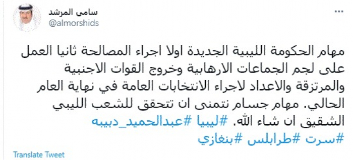 وقال في تغريدة عبر "تويتر" رصدها "المشهد العربي": "مهام الحكومة الليبية الجديدة أولاً إجراء المصالحة ثانيًا العمل على لجم الجماعات الإرهابية وخروج القوات الأجنبية والمرتزقة والإعداد لإجراء الانتخابات العامة في نهاية العام الحالي. مهام جسام نتمنى أن تتحقق للشعب الليبي الشقيق إن شاء الله".