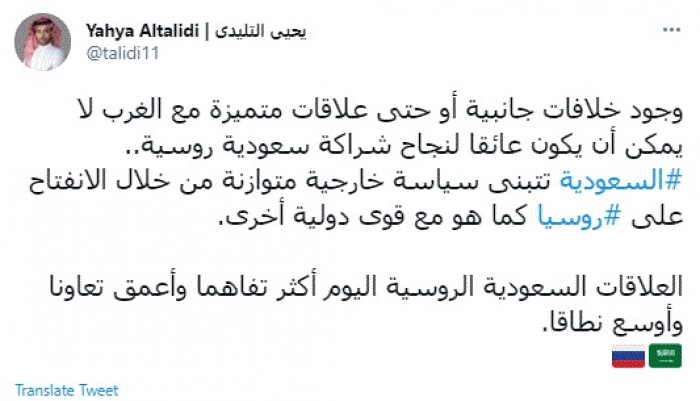 وكتب في تغريدة عبر "تويتر" رصدها "المشهد العربي": "وجود خلافات جانبية أو حتى علاقات متميزة مع الغرب لا يمكن أن يكون عائقا لنجاح شراكة سعودية روسية.. السعودية تتبنى سياسة خارجية متوازنة من خلال الانفتاح على روسيا كما هو مع قوى دولية أخرى".