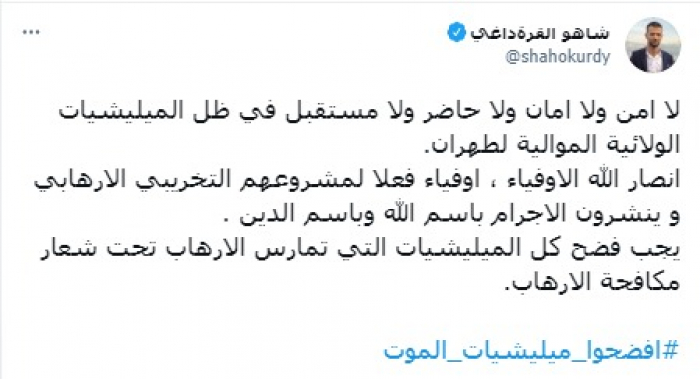رأى الكاتب الصحفي شاهو قرة داغي أن المليشيات الموالية لطهران تحرم العراق من الأمان والمستقبل.