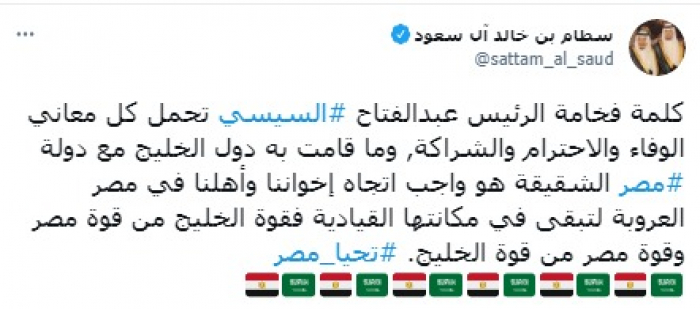 أشاد الأميرالسعودي سطام بن خالد أل سعود، بكلمة الرئيس المصري عبدالفتاح السيسي، التي عبر خلالها عن تقديره لمساندة دول الخليج لمصر.