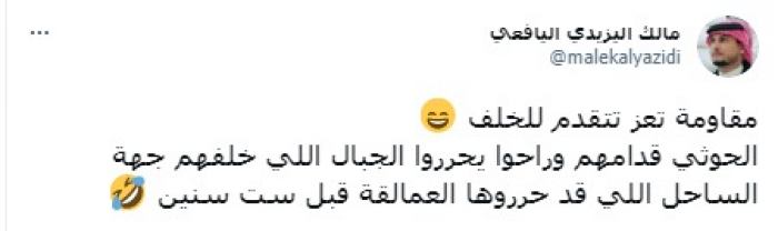 وقال في تغريدة على حسابه بموقع التدوين المصغر تويتر، اليوم إن: "مقاومة تعز تتقدم للخلف".