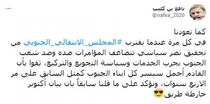 اعتبر الناشط السياسي نافع بن كليب أن المؤامرات تتزايد مع اقتراب المجلس الانتقالي الجنوبي من تحقيق انتصارات سياسية.