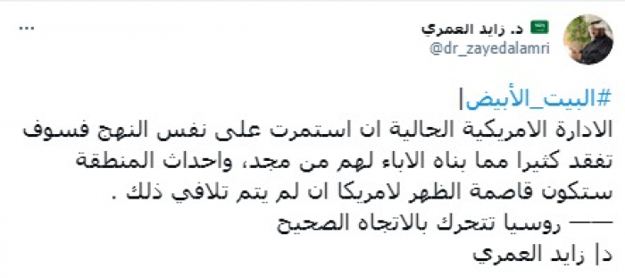 رأى المحلل الاستراتيجي الدكتور زايد العمري أن نهج الإدارة الأمريكية التي يقودها الرئيس جو بايدن يقودها إلى خسائر قاصمة.