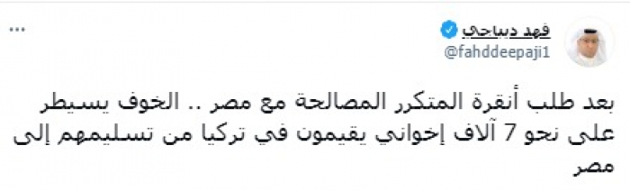 وأشار في تغريدة على حسابه بموقع التدوين المصغر تويتر، اليوم إلى أنه: "بعد طلب أنقرة المتكرر المصالحة مع مصر، الخوف يسيطر على نحو 7 آلاف إخواني يقيمون في تركيا من تسليمهم إلى مصر".