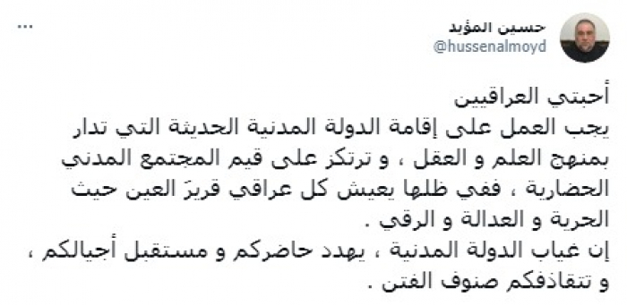وقال في تغريدة على حسابه بموقع التدوين المصغر تويتر، اليوم: "أحبتي العراقيين يجب العمل على إقامة الدولة المدنية الحديثة التي تدار بمنهج العلم و العقل، وترتكز على قيم المجتمع المدني الحضارية".