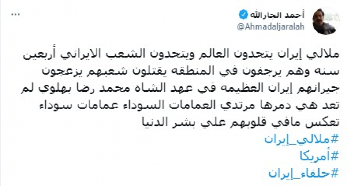 قال الكاتب الصحفي أحمد الجارالله، إن نظام ملالي طهران يتحدون العالم ويقتلون شعبهم، ويزعجون جيرانهم.